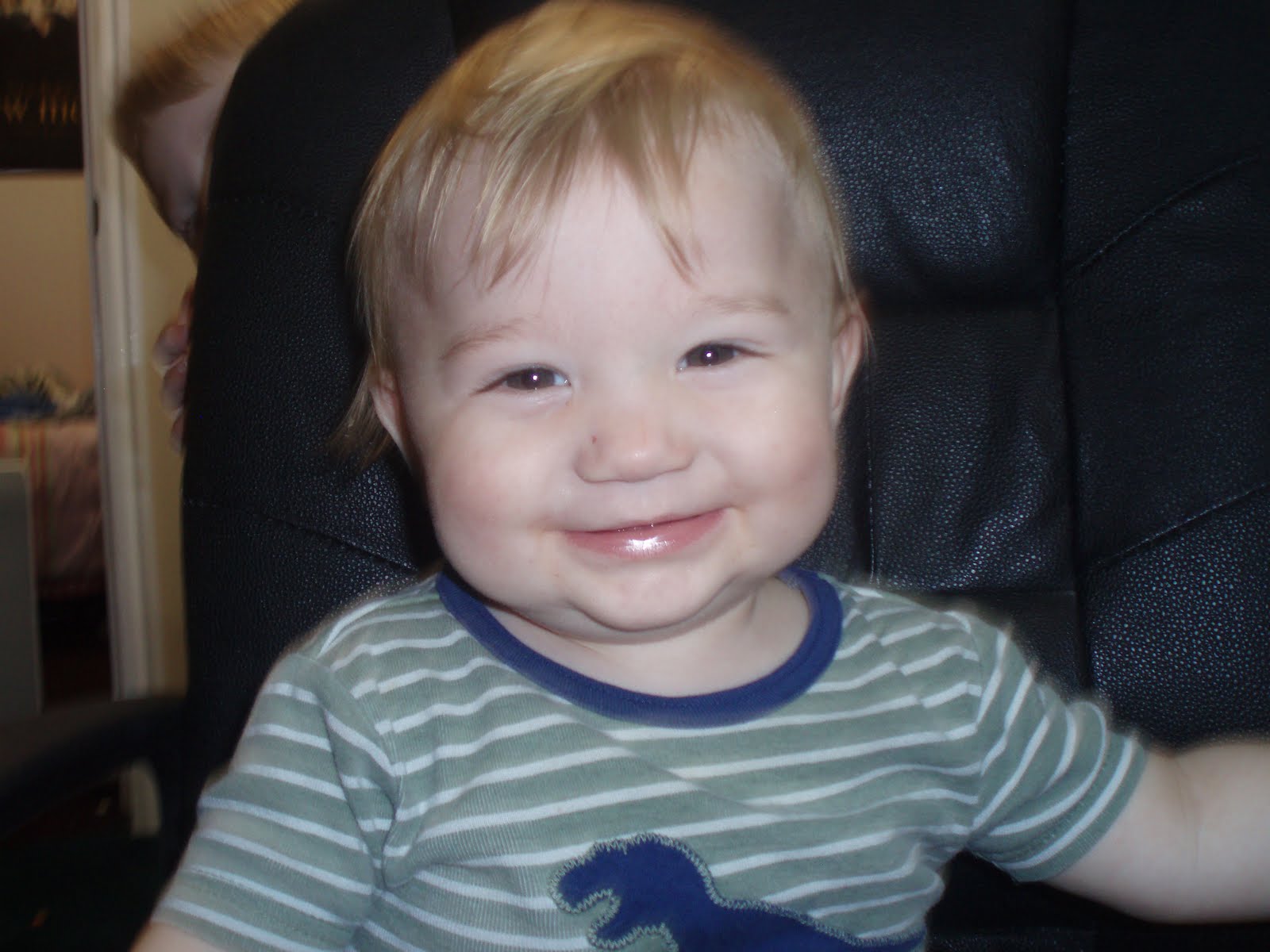 Tyler's first year is going by much too fast. In 7 short weeks, he'll be turning one. He is such an amazing little angel and I adore being his mama. He is starting to talk and can say-"hello, cat, phone, and uh-oh." He is also copying everything we do, such as brushing hair and teeth, talking on the phone, etc. He loves to be held and point where he wants you to walk to. He also loves playing peek-a-boo and "gonna get you." He crawls all over the house and is in to everything. He crawls normal with one leg and up on his foot with the other leg. It is the cutest little gimp crawl I have ever seen. He LOVES to be outside, especially when he can find the cat or if Bubba is giving him a stroller ride. He loves to drink out of a sippy without the stopper in it or out of a regular cup, but he will only drink water and is also very selective with the food he puts in his mouth. It is such a battle to get him to eat any solid food at all everyday and usually, I lose. Nana is the only who can get him to eat on a regular basis. At the rate he's going, I'll still be nursing him when he leaves for college! His lack of eating isn't slowing his growth down at all though. At his 9 month check-up he weighed in at 23lbs 2oz and is 30in. We found out in July that he has a milk allergy, but since he and I stopped eating all dairy he is feeling and acting much better and I'm changing waaaaay less diapers everyday. Hopefully he'll outgrow it in the next couple of years. Overall, he is such a happy boy and just loves life. He always has a very "content" look on his face. He adores his siblings and follows them around all day. Caden was gone overnight this week and when he got home, Tyler couldn't contain his excitement. My two boys played and wrestled and giggled for 30 minutes after Caden got back. It was so sweet.